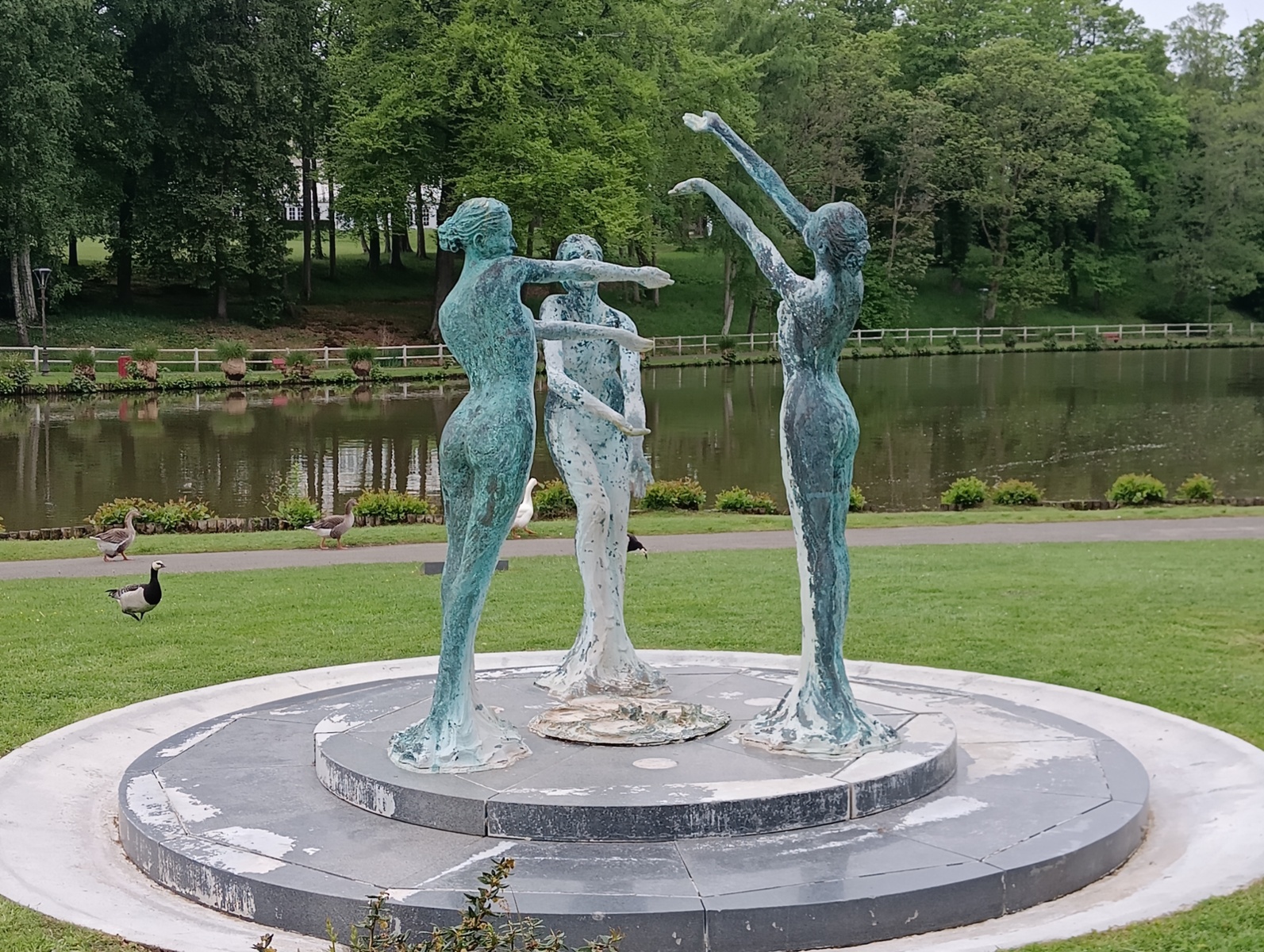 Mardi après-midi, nous nous retrouvons pour la visite de Forges-les-Eaux avec une conférencière de l’Office du Tourisme devant la fontaine en bronze qui représente trois statues de femmes identiques « Les Trois Grâces » du sculpteur normand Jean-Marc Le Pas.